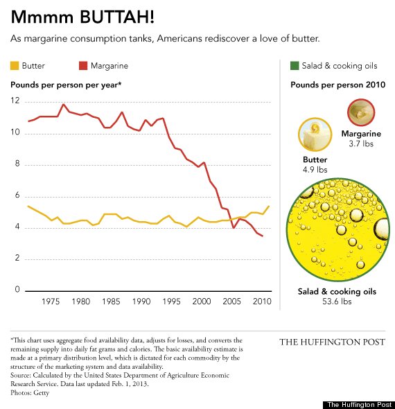 While butter consumption is up, that doesn’t mean we get most of our fat from butter. Butter consumption clocked in at 4.9 pounds in 2010, but the consumption of salad and cooking oils was 53.6 pounds that year. As far as fat goes, oil is the most popular, and that is a good thing. While not all oils are good, for example, vegetable oil is just as highly processed as margarine, many oils provide more health benefits and less bad (saturated) fats than butter does.