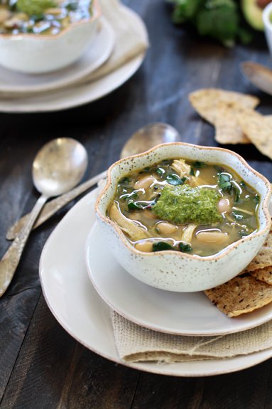 Usually you top chili with green onions and a pinch of cheese, but I love the idea of topping a white chili with cilantro pesto.