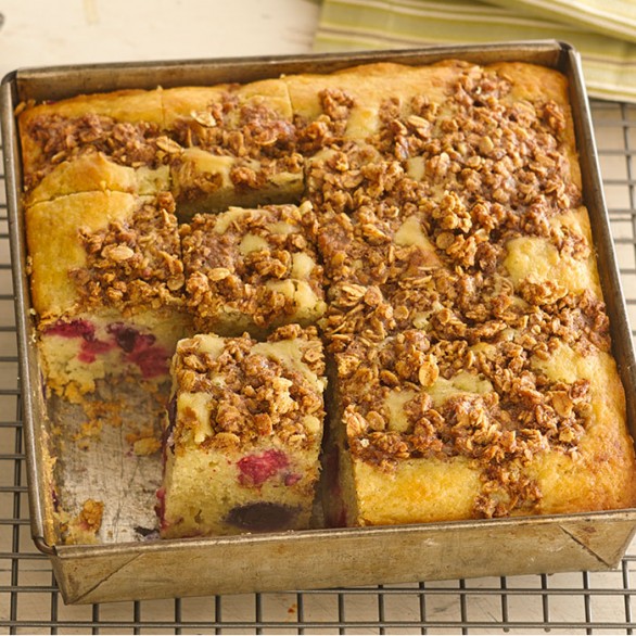 Perfect for breakfast or as dessert, this berry cake is packed with real fruit and wholesome ingredients. This recipe uses blueberries and raspberries, as well as mashed bananas, oats and honey granola, and low fat buttermilk to keep this cake low calorie and full of flavor.