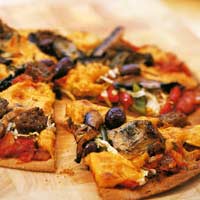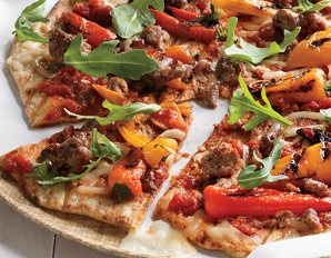 Here is another pizza with some meat to spice up a thin crusted pizza. Substitute real sausage with spicy turkey sausage and you have a pizza that will light your tastebuds on fire.