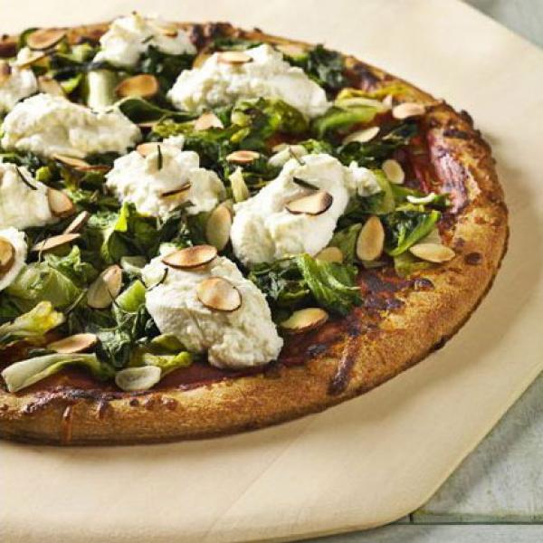 Pizza with Wilted Greens, Almonds, and Ricotta via Shape